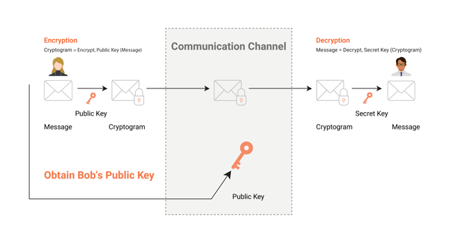 The following image shows how Alice can send an encrypted message to Bob using public-private cryptography. First, Alice retrieves Bob’s public key (can be published on the Internet, in the open). Then, Alice encrypts her message M with Bob’s public key, generating a cryptogram. That cryptogram is then sent to Bob over the Internet. Bob retrieves the cryptogram. After that, he can use his private key to decrypt it, revealing the original message M.