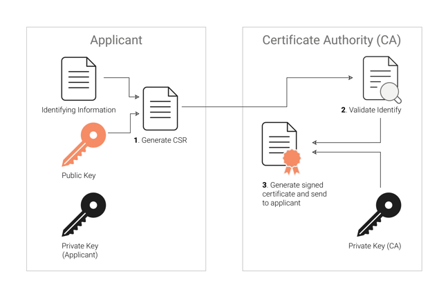 The user (you) creates a new keypair (public key and private key). After that, we wrap the public key in a message called a Certificate Signing Request (CSR). This message contains assertions: what is the public key, what is the purpose of the certificate (payments, email, networks, etc), the expiry date (6-24 months, typically). This corresponds to step 1 of the figure.